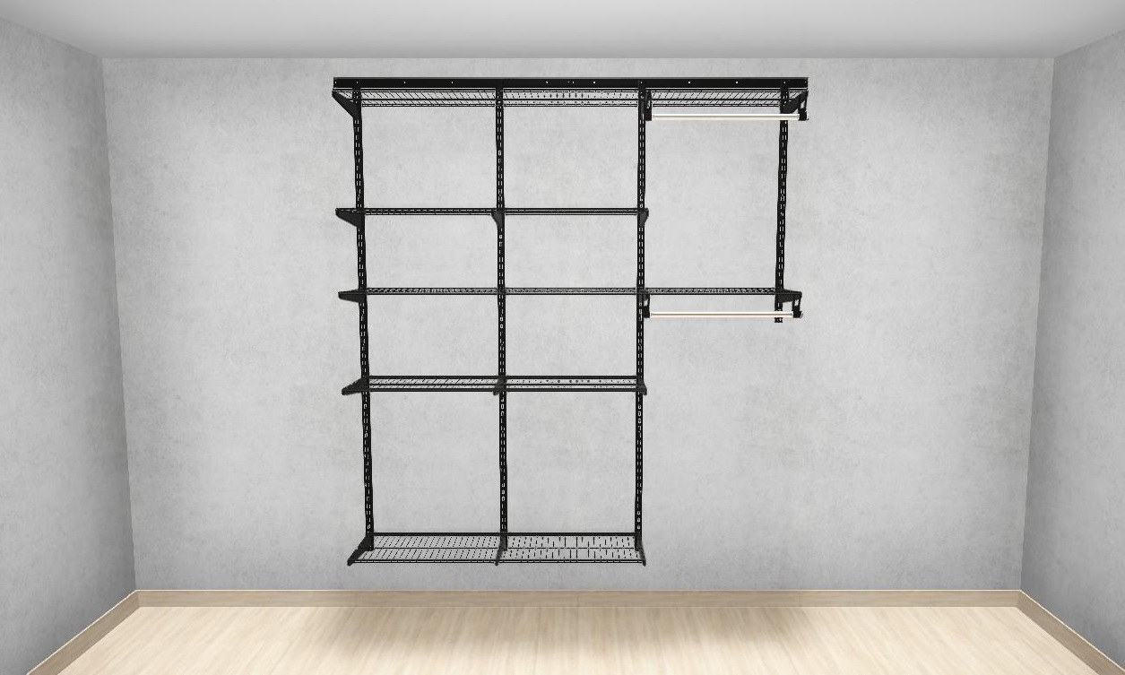 В комплект входят несущие рельсы и навесные направляющие, полки, штанги, аксессуары, крепежные элементы. Можно докупить множество дополнительных компонентов для гардеробной системы.