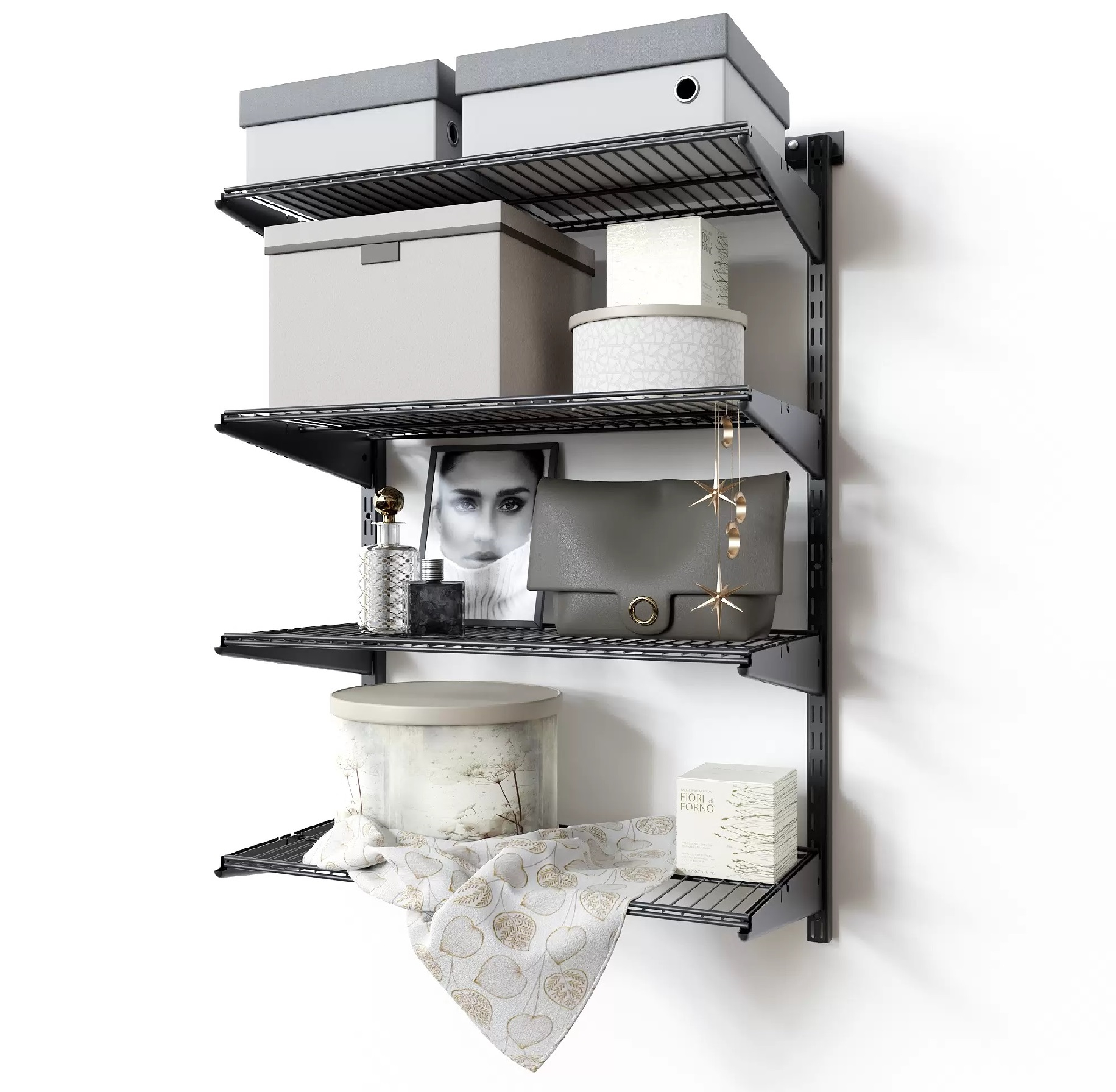 В комплект входят несущие рельсы и навесные направляющие, полки, штанги, аксессуары, крепежные элементы. Можно докупить множество дополнительных компонентов для гардеробной системы.