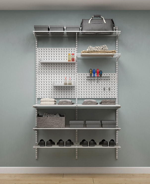 В комплект входят несущие рельсы и навесные направляющие, полки, штанги, аксессуары, крепежные элементы. Можно докупить множество дополнительных компонентов для гардеробной системы.