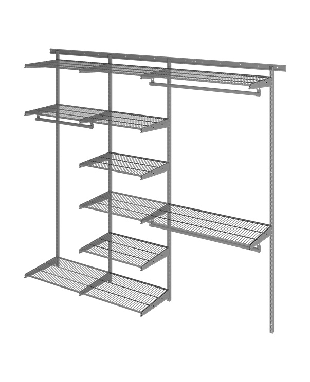 В комплект входят несущие рельсы и навесные направляющие, полки, штанги, аксессуары, крепежные элементы. Можно докупить множество дополнительных компонентов для гардеробной системы.