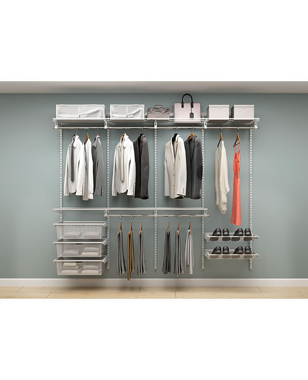 В комплект входят несущие рельсы и навесные направляющие, полки, штанги, аксессуары, крепежные элементы. Можно докупить множество дополнительных компонентов для гардеробной системы.