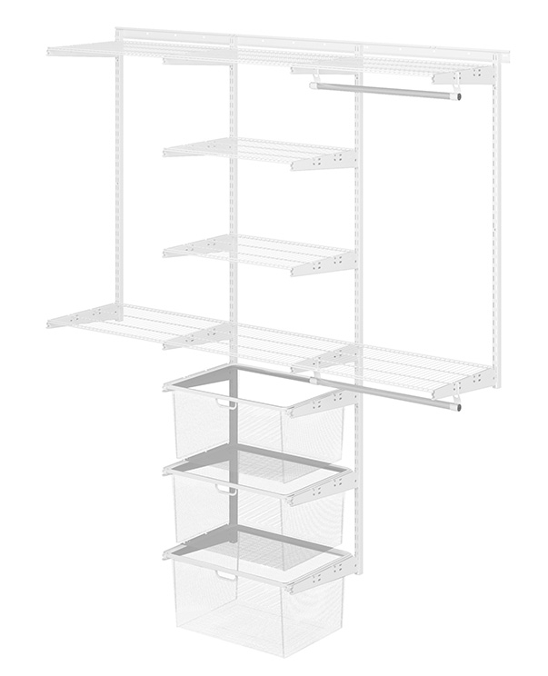 В комплект входят несущие рельсы и навесные направляющие, полки, штанги, аксессуары, крепежные элементы. Можно докупить множество дополнительных компонентов для гардеробной системы.