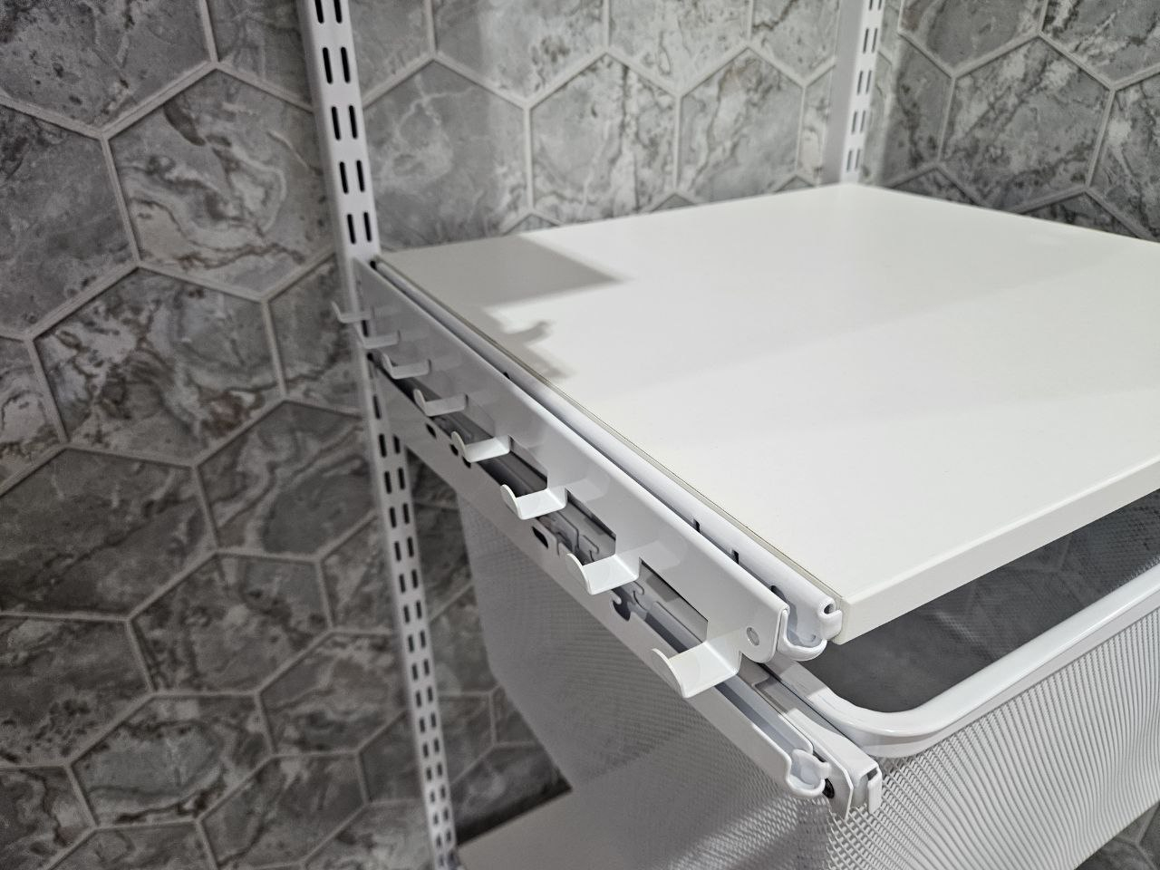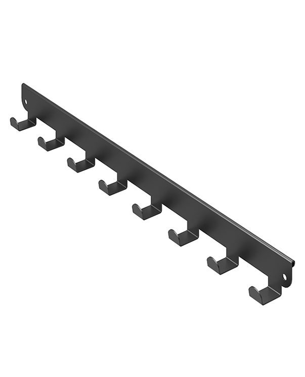 Крючки боковые представляют собой металлическую планку на 6 или 8 крючков (для кронштейнов глубиной 335 и 435 мм), которая навешивается на внешнюю боковую поверхность кронштейна в гардеробной системе ПРАКТИК Home.