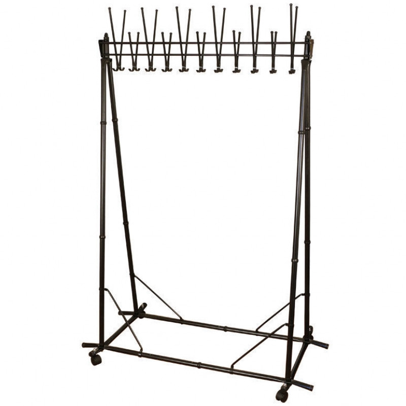 Групповая вешалка на 22 крючка. Вешалка выполнена из оцинкованной стали с полимерным покрытием. Крючки вешалки выполнены из трубы диаметром 10 мм. Вешалка поставляется в разобранном виде, в картонной таре. Эта модель вешалки может использоваться как фрагмент для обустройства гардеробных комнат. Снабжены колесами.