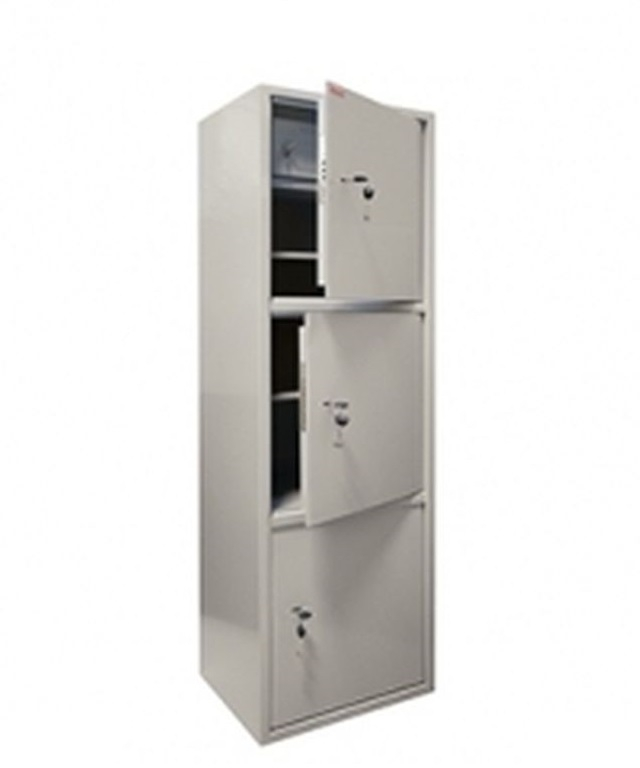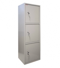 Шкаф представляет собой сварную металлическую конструкцию прямоугольной формы. Горизонтальные перегородки делят шкаф на 3 независимых отделения, запираемых собственной дверью. Корпус и двери шкафа изготовлены из стального листа толщиной 1,2 мм. Двери изнутри усилены панелью коробчатого сечения из стального листа толщиной 0,8 мм. Шкаф комплектуется 3-мя съемными регулируемыми по высоте полками, а верхнее отделение шкафа дополнительно оборудовано отсеком ограниченного доступа (трейзер), запираемым замком «почтового» типа. Петли шкафа – внутренние. Окраска - полимерное порошковое покрытие, цвет серый.