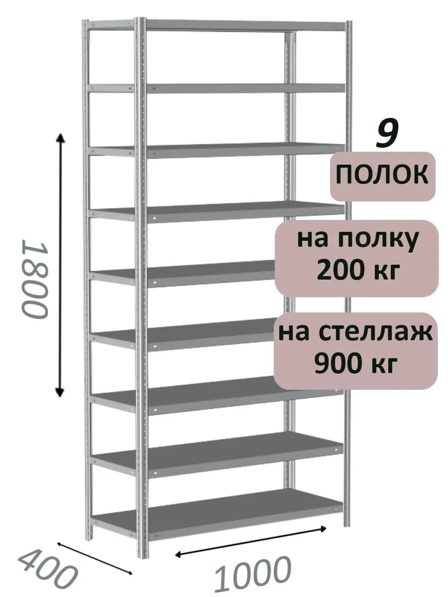 Стеллаж металлический полочный МС-900 1800х1000х400, 9 полок, светло-серый