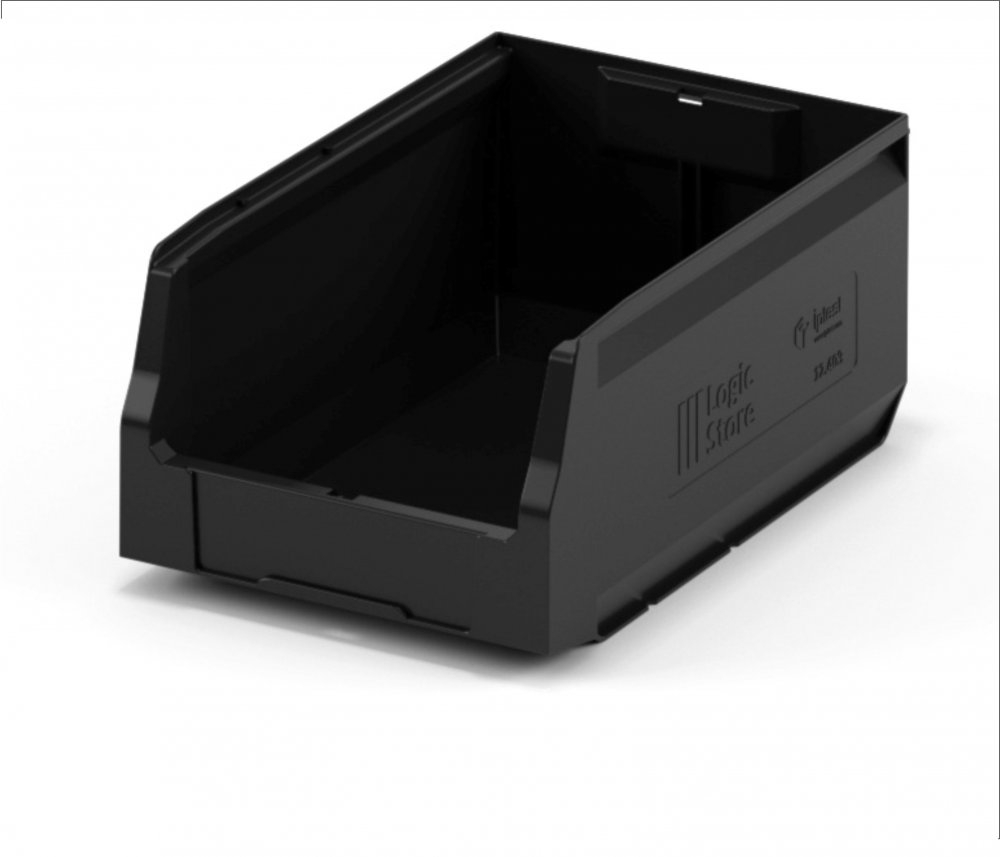 За счет убранных внутрь ребер жесткости контейнера достигается экономия пространства на 15%. Шероховатая поверхность дна предотвращает скольжение на стеллажах и лентах транспортеров, а специальный профиль придает прочность и жесткость боковым стенкам контейнера.