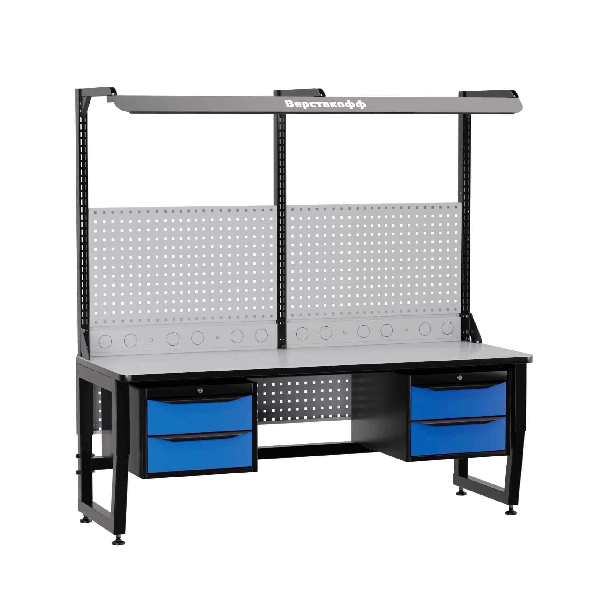 Для наилучшей освещенности при работе с мелкими электронными компонентами рабочее место комплектуется блоком освещения. В его составе - специальный промышленный светильник с необходимой цветовой температурой и световым потоком, обеспечивающим оптимальные условия работы. Блок освещения располагается над рабочей поверхностью на регулируемых (по высоте и по вылету) кронштейнах
