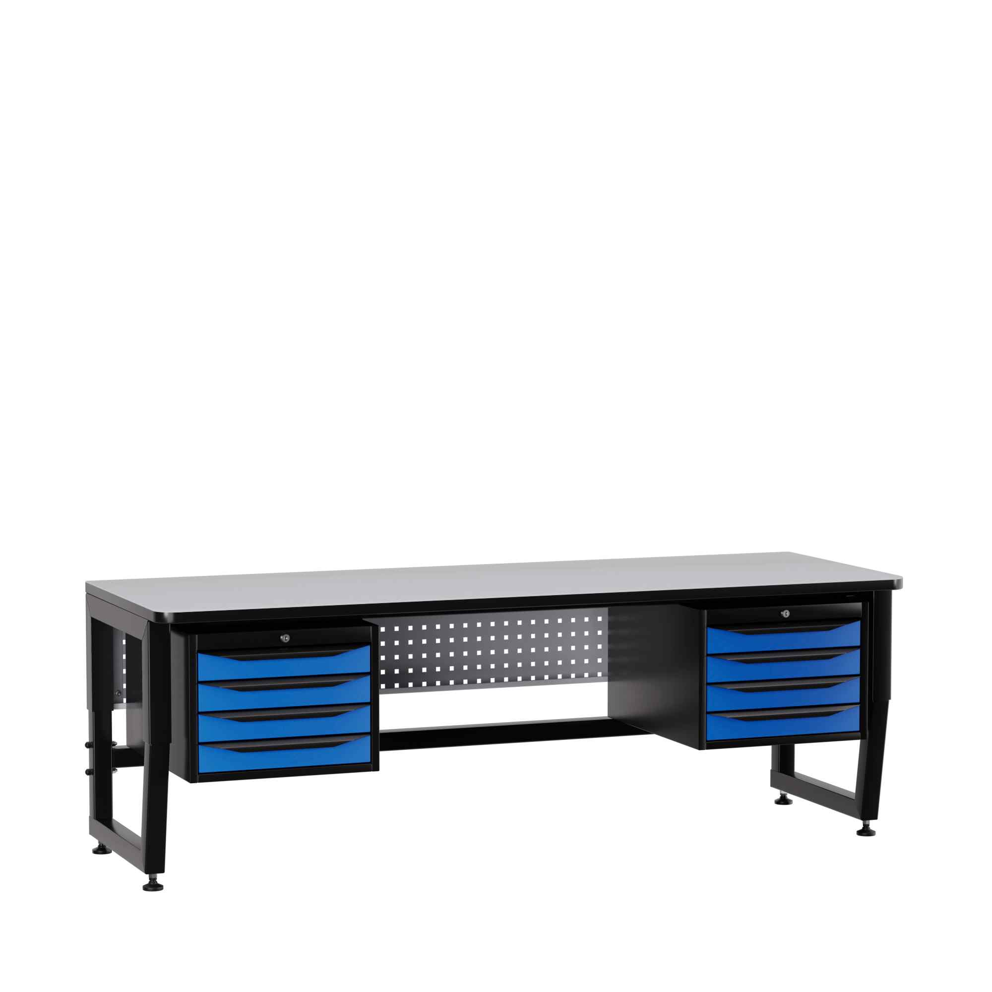 Несущая конструкция стола – это промышленный ESD каркас. Сочетание опорных, несущих и усиливающих элементов из металла, обеспечивают высокую надежность конструкции при интенсивной промышленной эксплуатации с распределенными нагрузками на рабочее место до 300 кг. Регулируемые опоры с возможностью плавной регулировки по высоте позволяют установить удобную высоту рабочей поверхности от 700мм до 850мм. Специальное ESD полимерное покрытие элементов каркаса с сопротивлением 1 МОм обеспечивают антистатические свойства изделия