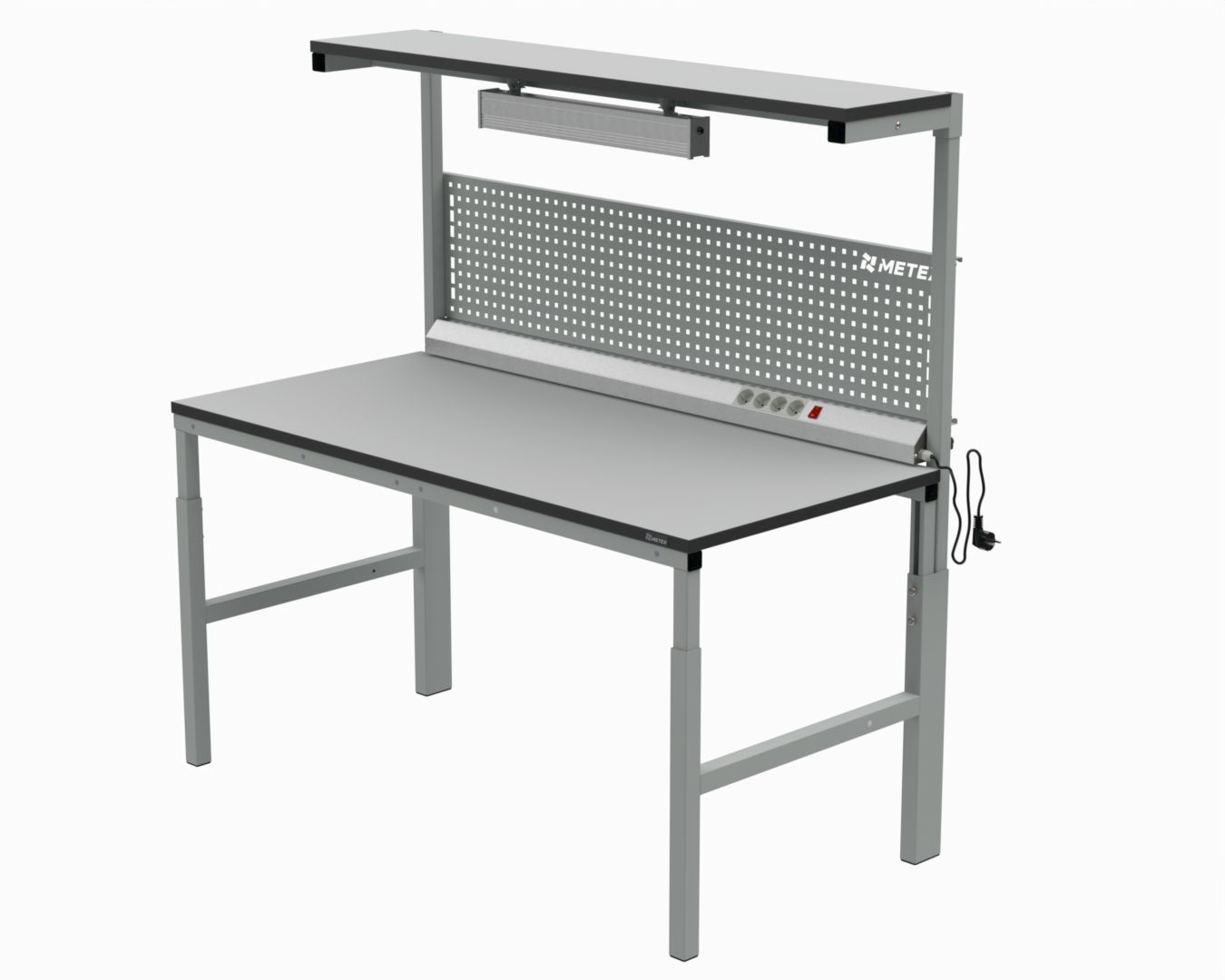 В комплект стола входит стол серии 41.Б, комплект задних стоек, верхняя полка шириной 300 мм, перфорированный экран, электромонтажная панель и светодиодный светильник 600 мм под полку.