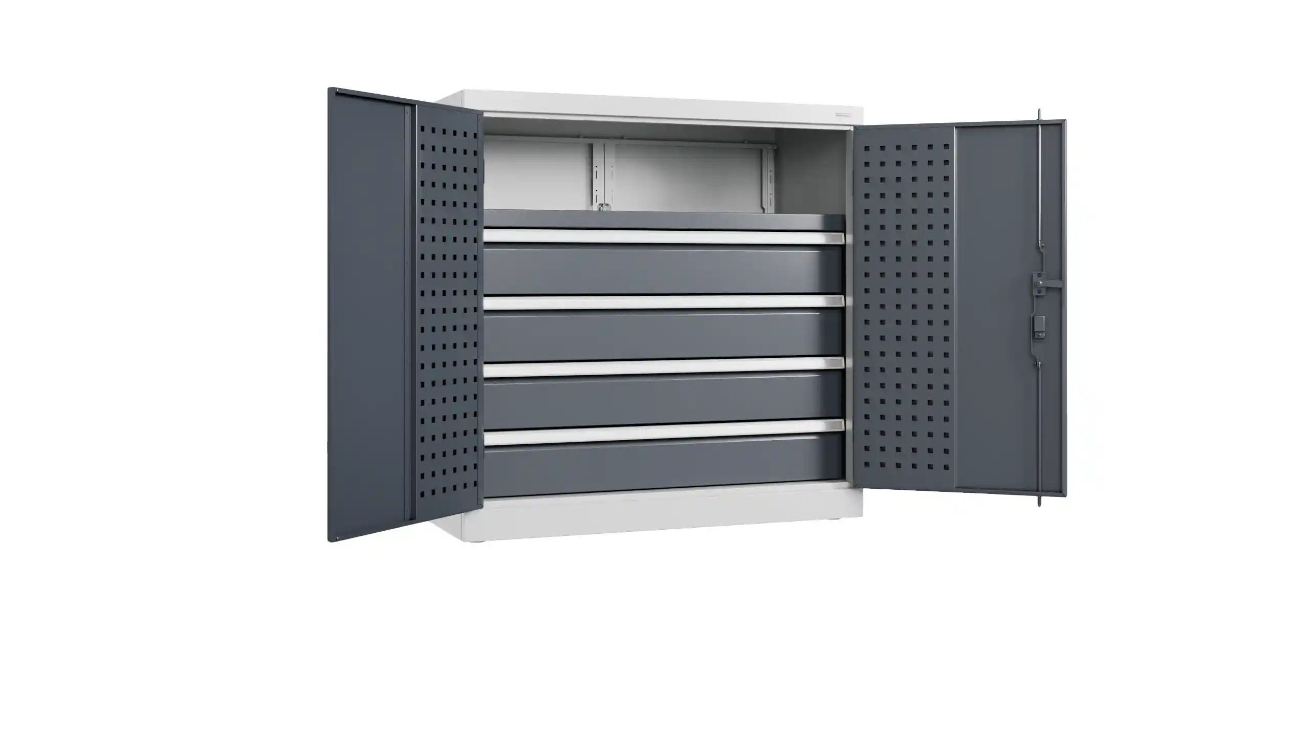 Шкаф антресольный инструментальный Fabrik тяжёлой серии представляет собой сборно-разборную конструкцию, предназначен для хранения оснастки, приспособлений и инструмента в мастерских, цехах и других производственных зонах. Шкаф изготовлен из листовой стали, имеет ригельный замок обеспечивающий надежное запирание дверей.