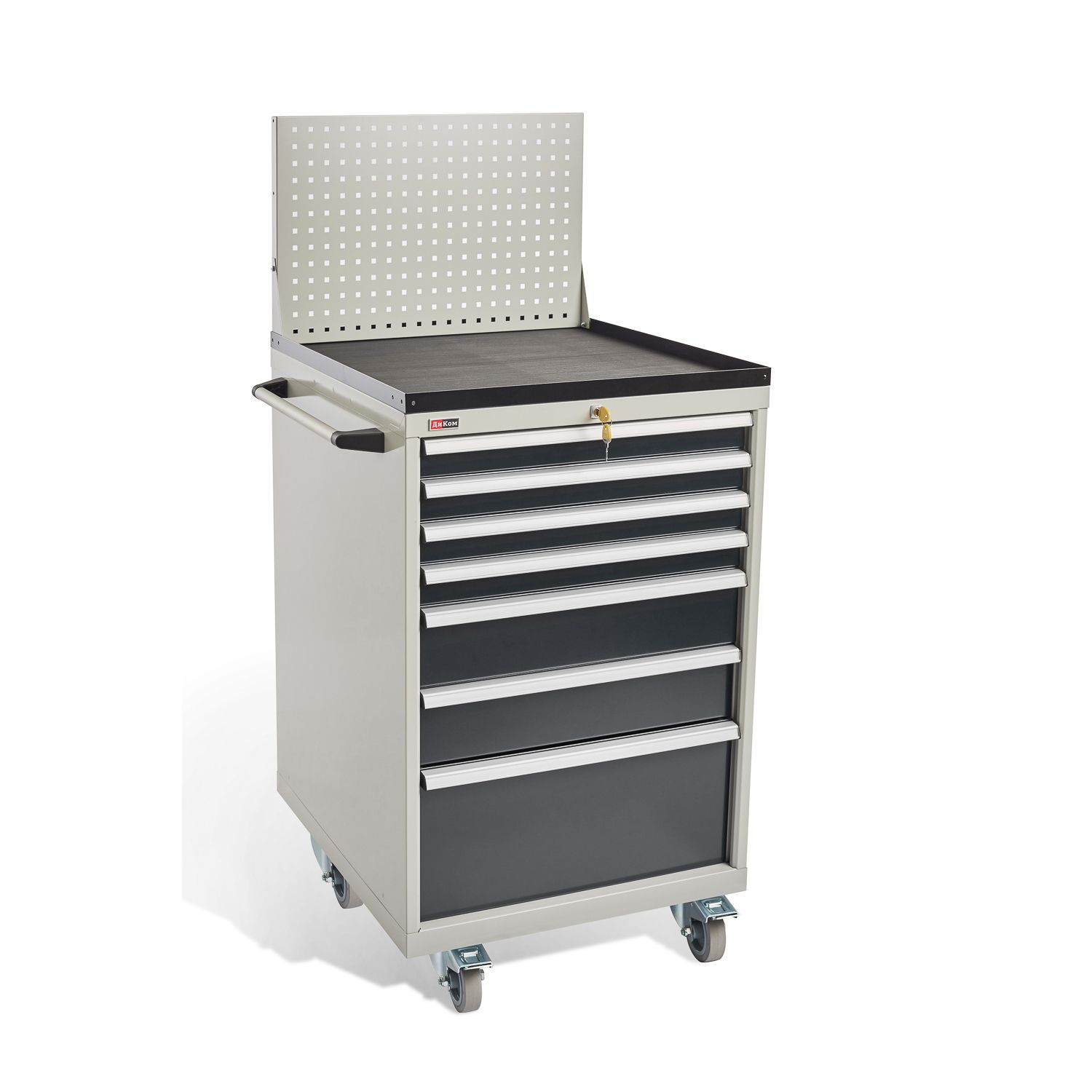 Тумбы окрашены эпоксидной порошковой краской, устойчивой к механическим воздействиям и агрессивным жидкостям: корпус и экран – серые RAL 7038; ящики и двери – антрацитовый серый RAL 7016.