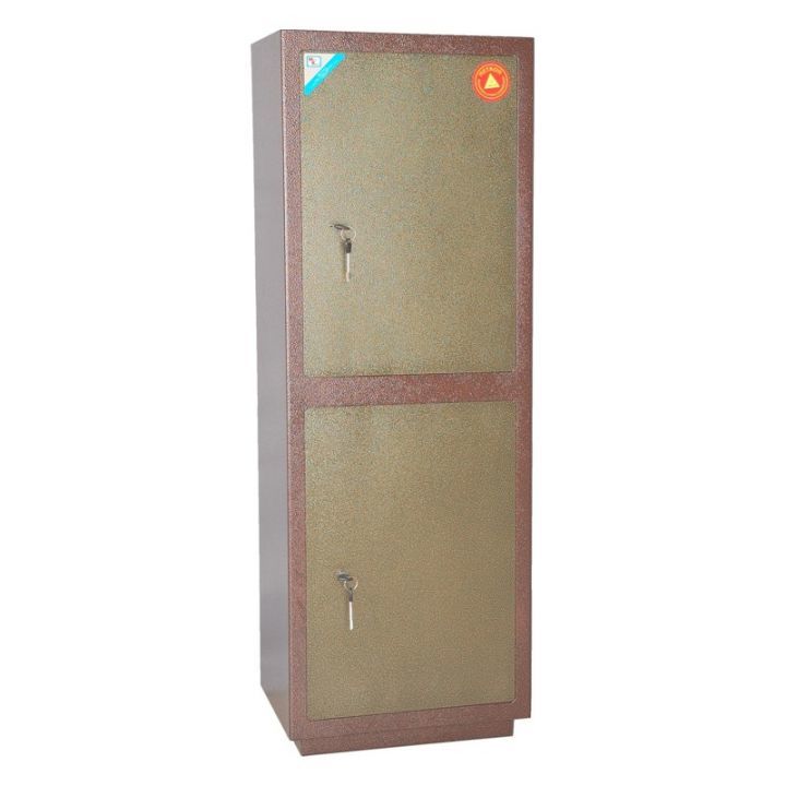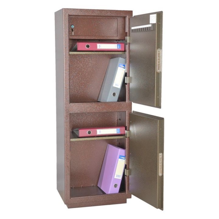 Сейф двухсекционный, оснащен двумя съемными полками и Трейзером. В двери установлен ключевой 8-ми сувальдный замок ЗАО «Про-Сам» г. Рязань или аналогичный замок другого производителя.