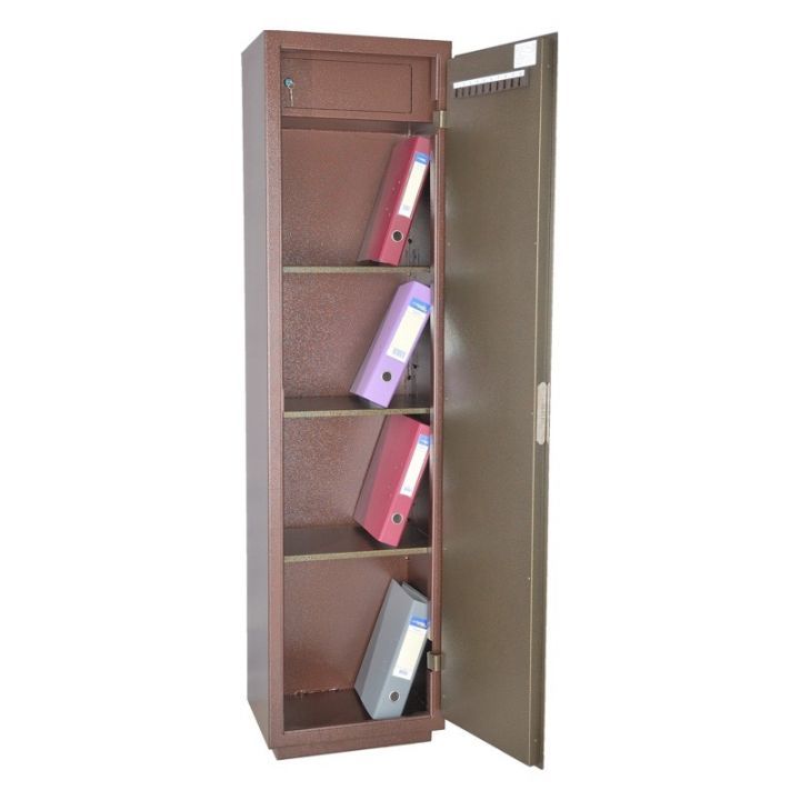 Сейф односекционный, оснащен тремя съемными полками и Трейзером. В двери установлен ключевой 8-ми сувальдный замок ЗАО «Про-Сам» г. Рязань или аналогичный замок другого производителя.