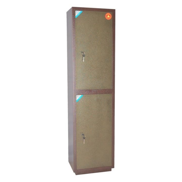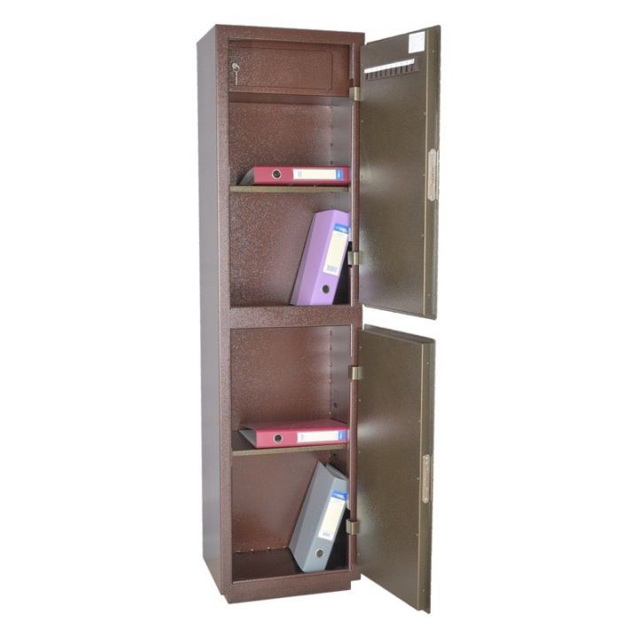 Сейф двухсекционный, оснащен двумя съемными полками и Трейзером. В двери установлен ключевой 8-ми сувальдный замок ЗАО «Про-Сам» г. Рязань или аналогичный замок другого производителя.