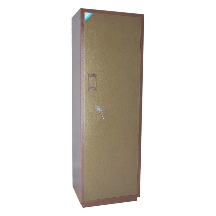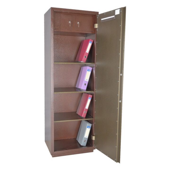 Сейф односекционный, оснащен тремя съемными полками и двумя Трейзерами. В двери установлен ключевой 8-ми сувальдный замок ЗАО «Про-Сам» г. Рязань или аналогичный замок другого производителя.