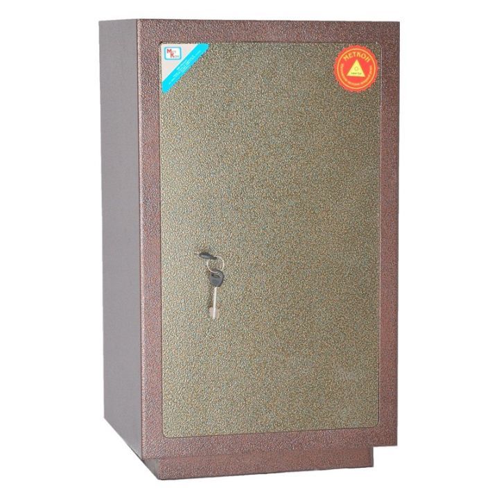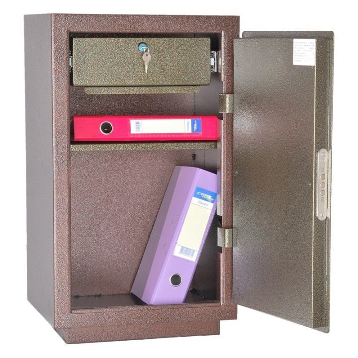 Сейф односекционный, оснащен одной съемной полкой и выдвигающимся Трейзером. В двери установлен ключевой 8-ми сувальдный замок ЗАО «Про-Сам» г. Рязань или аналогичный замок другого производителя.