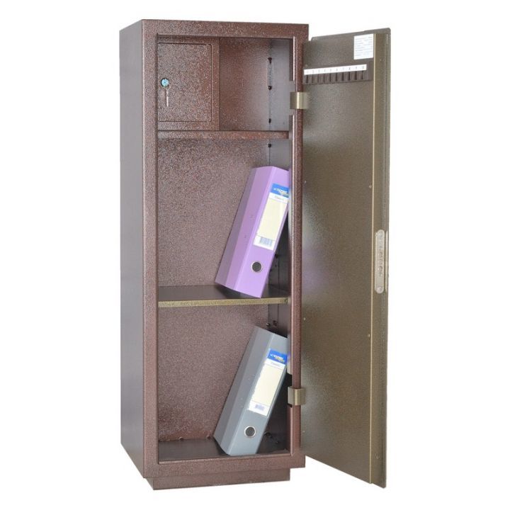 Сейф односекционный, оснащен одной съемной полкой и Трейзером. В двери установлен ключевой 8-ми сувальдный замок ЗАО «Про-Сам» г. Рязань или аналогичный замок другого производителя.