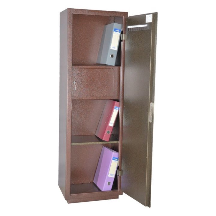 Сейф односекционный, оснащен одной съемной полкой и Трейзером. В двери установлен ключевой 8-ми сувальдный замок ЗАО «Про-Сам» г. Рязань или аналогичный замок другого производителя.