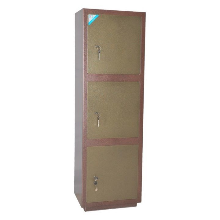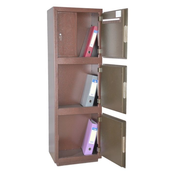 Сейф трехсекционный, оснащен Трейзером. В двери установлен ключевой 8-ми сувальдный замок ЗАО «Про-Сам» г. Рязань или аналогичный замок другого производителя.