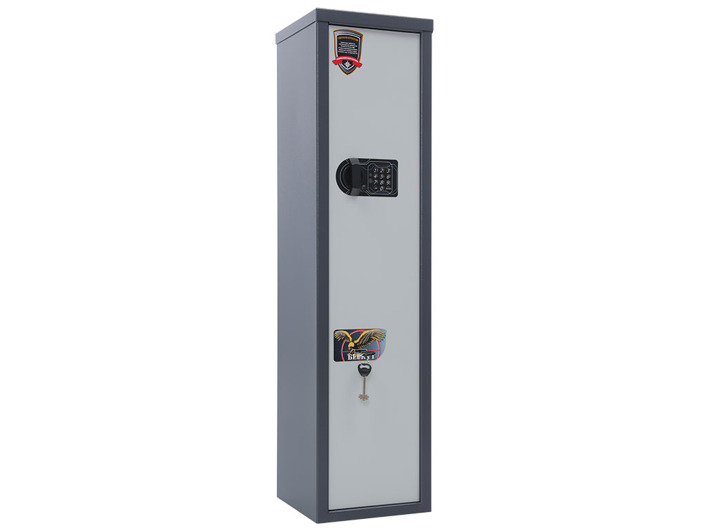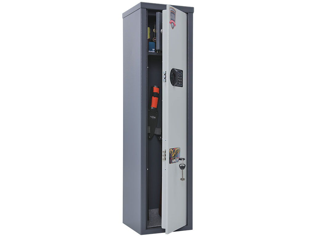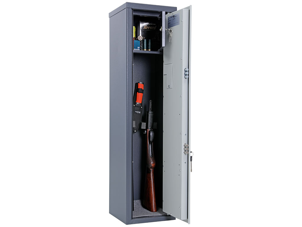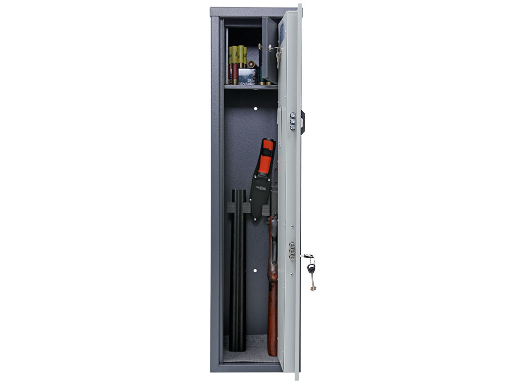 Толщина металла корпуса и двери – 2 мм оборудованы патронным отделением, запирающимся на ключ, и ложементами для ружей