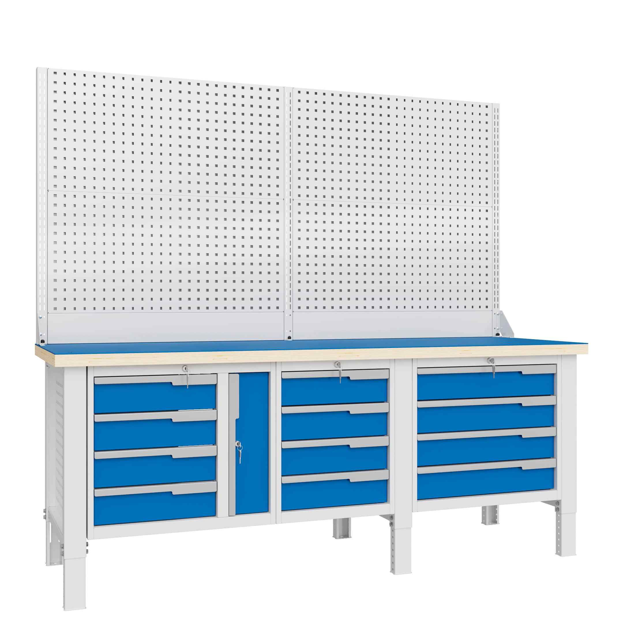 Регулировка рабочего места по высоте осуществляется в диапазоне от 700 до 950мм с шагом 25мм. Предусмотрена возможность тонкой регулировки усиленным резьбовым подпятником. Нагрузка на ящики верстака - до 40 кг, на полки - до 60кг. Общая распределенная нагрузка на рабочую поверхность 1500кг. Имеет возможность стыковки в единую рабочую поверхность с верстаками серии Constructor