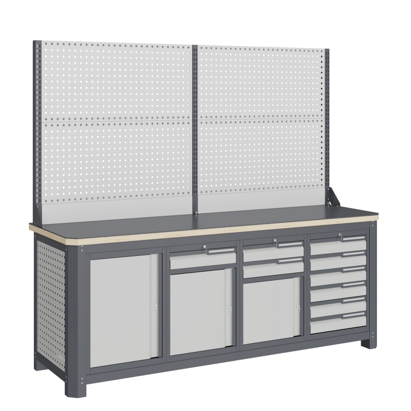 Экран (перфорированная панель) верстака выполнен с квадратной перфорацией 12х12 мм с шагом 38 мм для установки крючков, держателей и других аксессуаров. Экран крепятся к столешнице с помощью специальных кронштейнов. Максимальная масса груза, равномерно распределенного по поверхности экрана, составляет 71 кг.