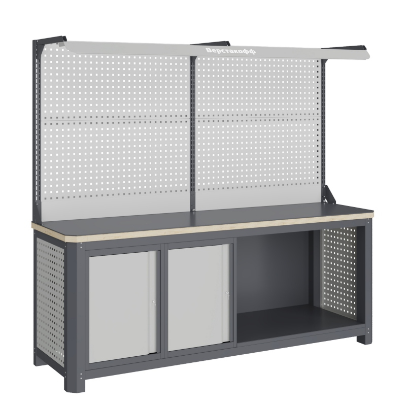 Верстак серии MECHANIC: MCN 2052.S77.11-2F состоит из столешницы шириной 1993 мм, рамы верстака, состоящей из опор, перемычек, боковых перфопанелей, двух малых модулей S7 и двух комплектов полка-стенка SW1, двойного экрана с кронштейнами и комплекта освещения.