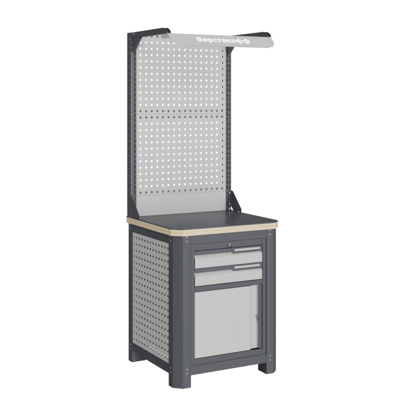 Экран (перфорированная панель) верстака выполнен с квадратной перфорацией 12х12 мм с шагом 38 мм для установки крючков, держателей и других аксессуаров. Экран крепятся к столешнице с помощью специальных кронштейнов. Максимальная масса груза, равномерно распределенного по поверхности экрана, составляет 71 кг.
