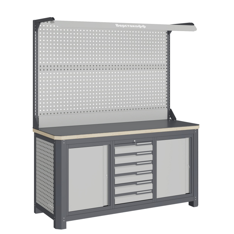 Верстак серии MECHANIC: MCN 1552.S677-2F состоит из столешницы шириной 1493 мм, рамы верстака, состоящей из опор, перемычек, боковых перфопанелей, малых модулей S6, S7, двойного экрана с кронштейнами и комплекта освещения.