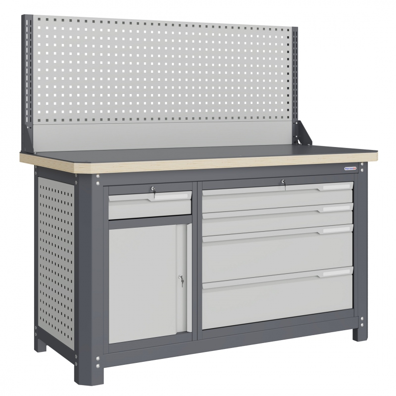 Верстак серии MECHANIC: MCN 1552.S8L4-1 состоит из столешницы шириной 1493 мм, рамы верстака, состоящей из опор, перемычек, боковых перфопанелей, малого модуля S8, большого модуля L4, одинарного экрана с кронштейнами.