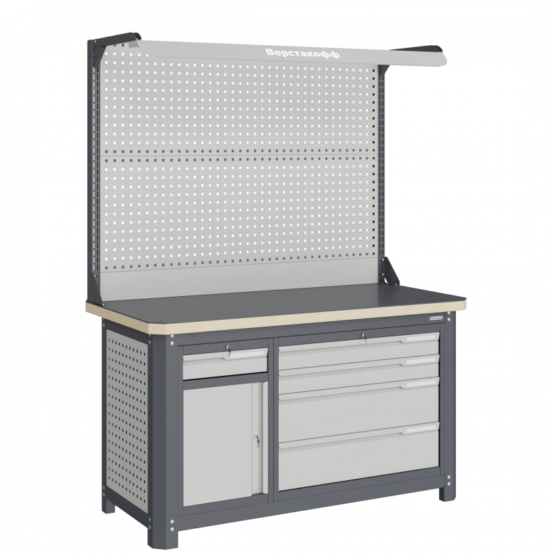 Верстак серии MECHANIC: MCN 1552.S8L4-2F состоит из столешницы шириной 1493 мм, рамы верстака, состоящей из опор, перемычек, боковых перфопанелей, малого модуля S8, большого модуля L4, двойного экрана с кронштейнами и комплекта освещения.