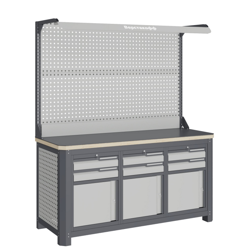 Экран (перфорированная панель) верстака выполнен с квадратной перфорацией 12х12 мм с шагом 38 мм для установки крючков, держателей и других аксессуаров. Экран крепятся к столешнице с помощью специальных кронштейнов. Максимальная масса груза, равномерно распределенного по поверхности экрана, составляет 71 кг.