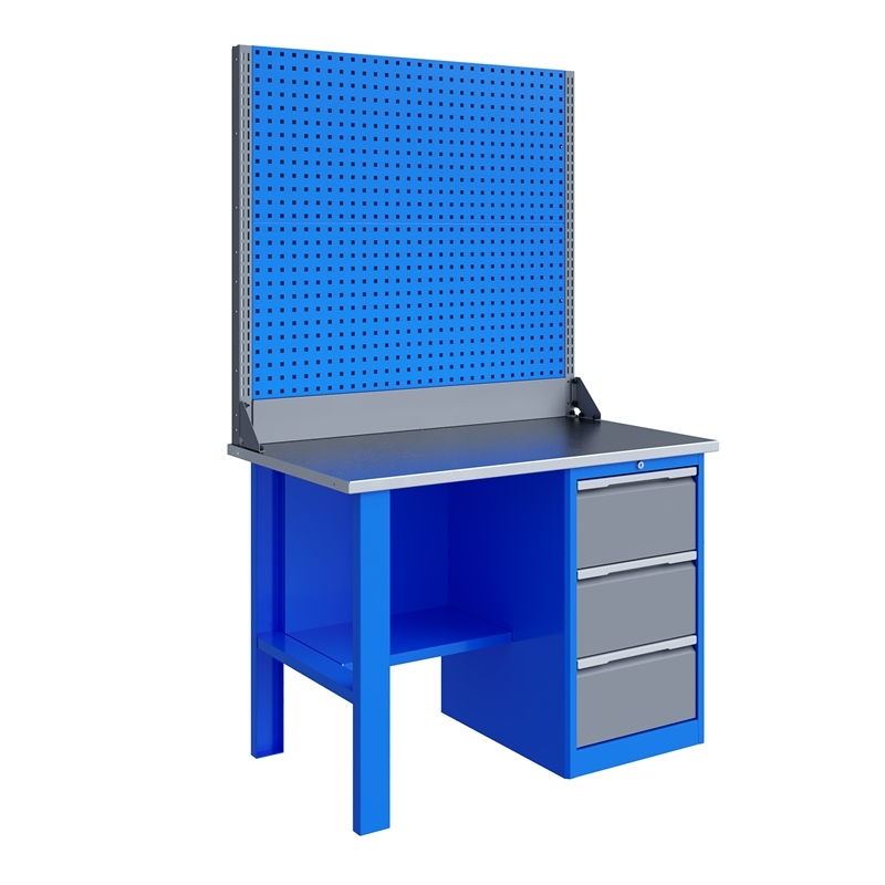 Двойной экран (перфорированные панели) верстака выполнен с квадратной перфорацией 12х12 мм с шагом 38 мм для установки крючков, держателей и других аксессуаров. Экран крепится к столешнице с помощью специальных кронштейнов. Максимальная масса груза, равномерно распределенного по поверхности экрана, составляет 100 кг.