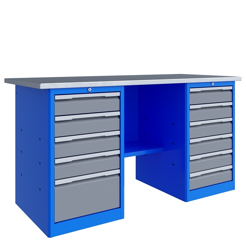 Тумбы верстаков выполнены сварными. Ящики в тумбах устанавливаются на шариковых телескопических направляющих полного выдвижения. В тумбе P5 установлено четыре малых и один большой ящик. В тумбе P6 установлено шесть малых ящиков. Внутренние размеры малых ящиков (ВхШхГ), не более: 103 х 397 х 520 мм. Внутренние размеры больших ящиков (ВхШхГ), не более: 222 х 397 х 520 мм. Тумбы с ящиками снабжены общим центральным замком с поворотом ригеля 180 градусов и подпружиненной тягой. В комплекте два ключа с каждой тумбой.