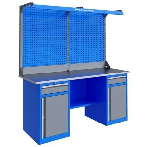 Верстак серии Technic 201.68.3-2F состоит из столешницы шириной 1996 мм, двух тумб P8 с малым ящиком и отделением с дверью, полки-стенки, двойного экрана с кронштейнами и комплекта освещения. Предназначен для выполнения сборочных, ремонтных, слесарных, монтажных и других видов работ на производстве, в сервисных центрах, мастерских, гаражах, а также для обучения технологии в учебных заведениях.