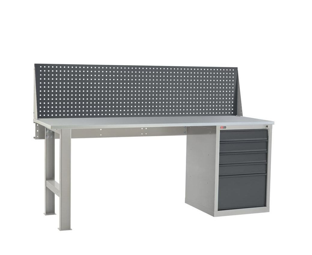 Верстак укомплектован перфорированным экраном, на него зацепами устанавливаются аксессуары.