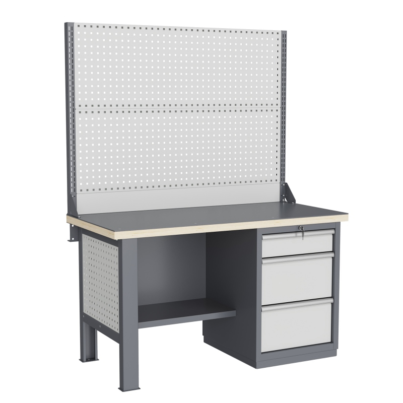 Верстак может комплектоваться одинарным или двойным перфорированным экраном, электромонтажным блоком для установки розеток и дополнительных устройств, а также комплектом освещения с держателем и лампой. Перфорация экрана подходит под стандартные держатели для инструментов, отверток, крючков, полок. Возможна комплектование верстака навесным элементами (держатели, крючки, полки).