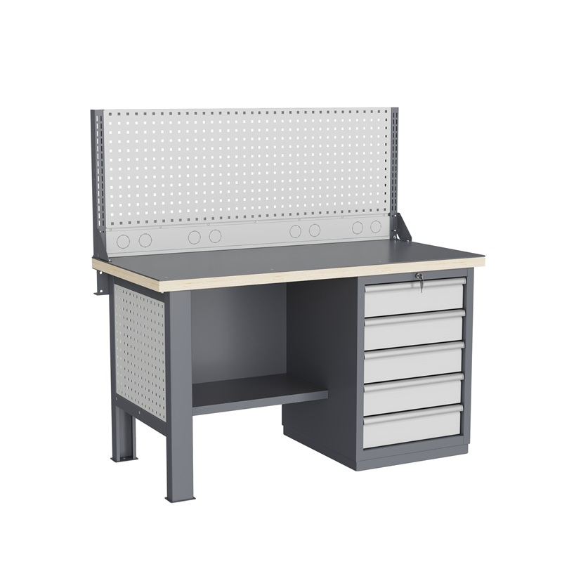 Верстак может комплектоваться одинарным или двойным перфорированным экраном, электромонтажным блоком для установки розеток и дополнительных устройств, а также комплектом освещения с держателем и лампой. Перфорация экрана подходит под стандартные держатели для инструментов, отверток, крючков, полок. Возможна комплектование верстака навесным элементами (держатели, крючки, полки).